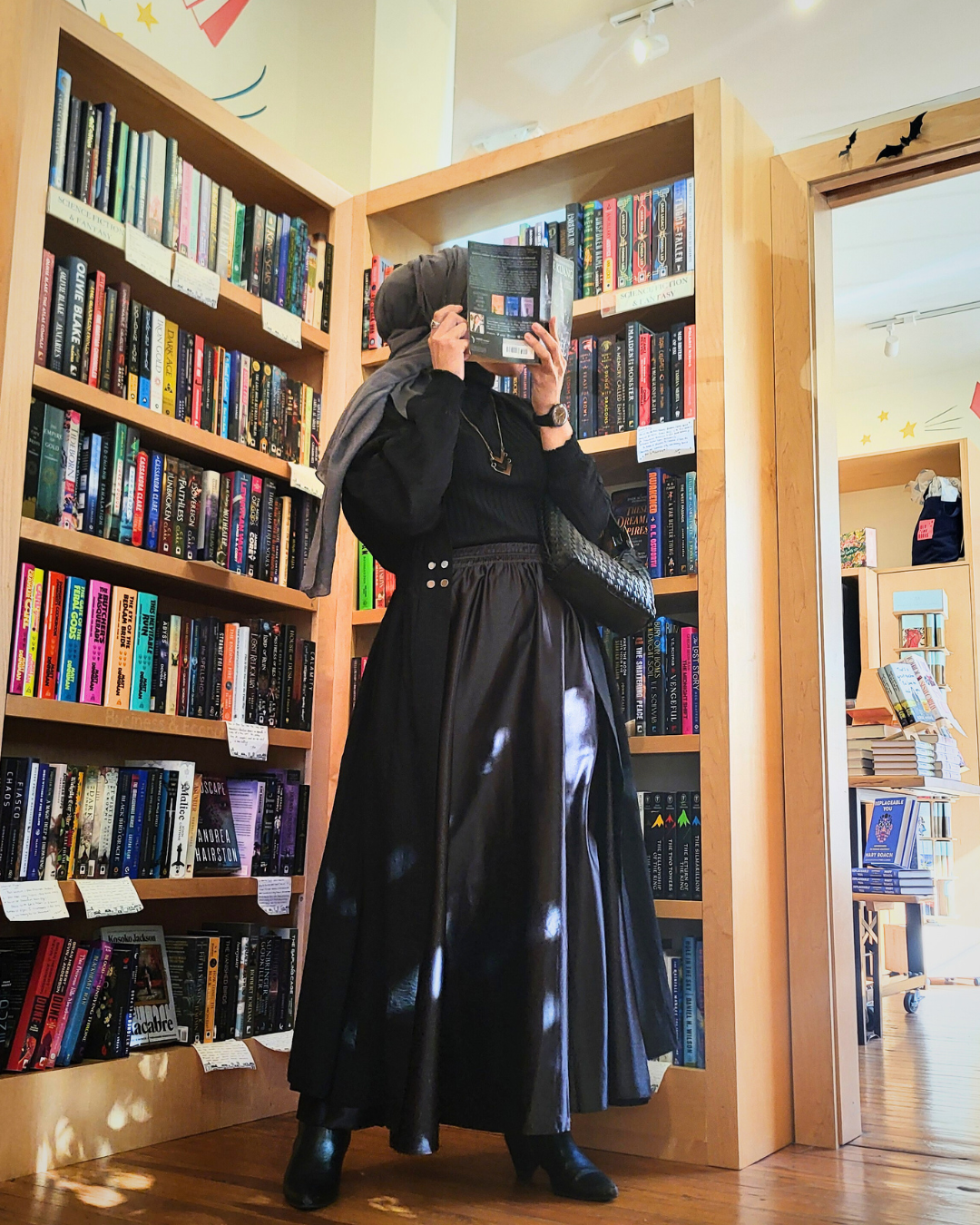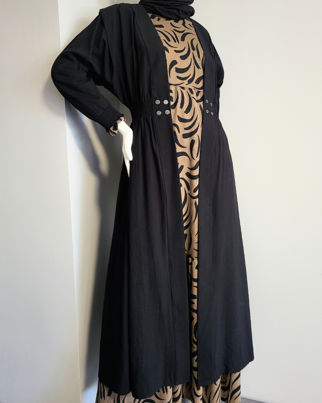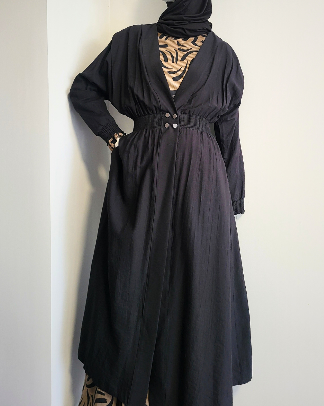 Elegant and understated, this overcoat in black is a versatile piece crafted from a light cotton-blend. Unlike the brown version, this fabric has a crisp texture that wrinkles naturally, adding relaxed sophistication to your look. The elasticized waist and cuffs create gentle curvature without compromising modesty, while the pointed shoulders and silver buttons detailing maintain structure and poise. Deep pockets add both function and style. The coat looks refined worn open or closed, making it perfect for day-to-night wear.
