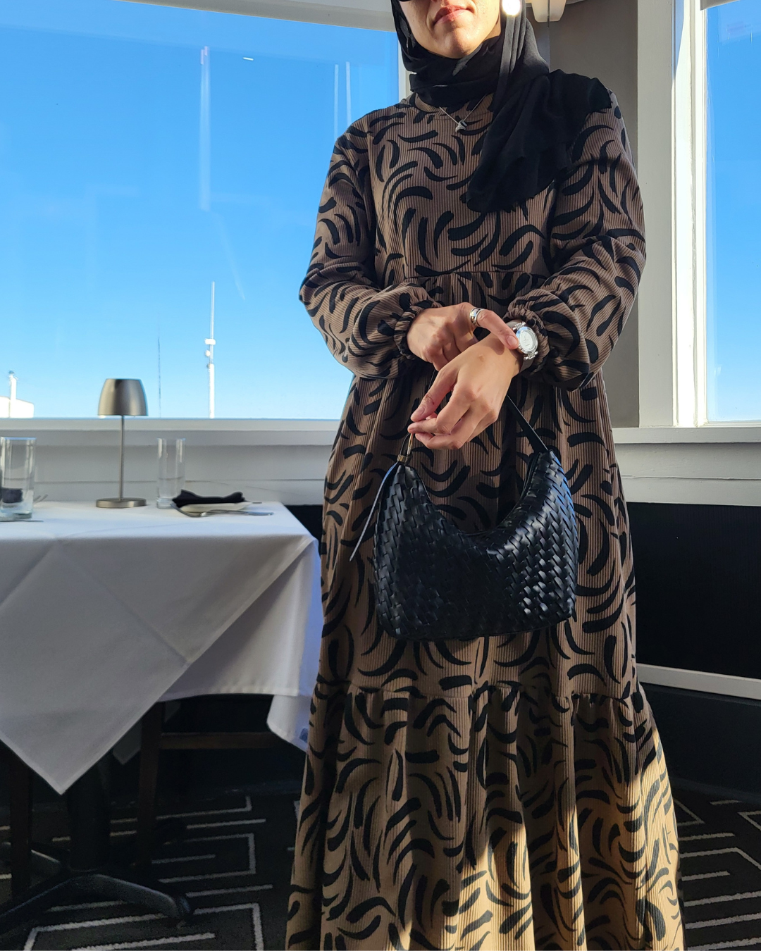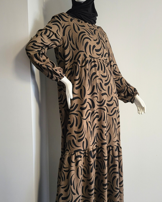 Warm, cozy, and effortlessly stylish, the Maxi Dress in Brown and Black is designed for comfort and movement. The ribbed fabric has a soft, substantial feel that is perfect for cooler days, offering a gentle stretch while maintaining its shape. A layered hem adds a playful, cottage-inspired touch, while the brown and black patterned design draws the eye with its natural movement.